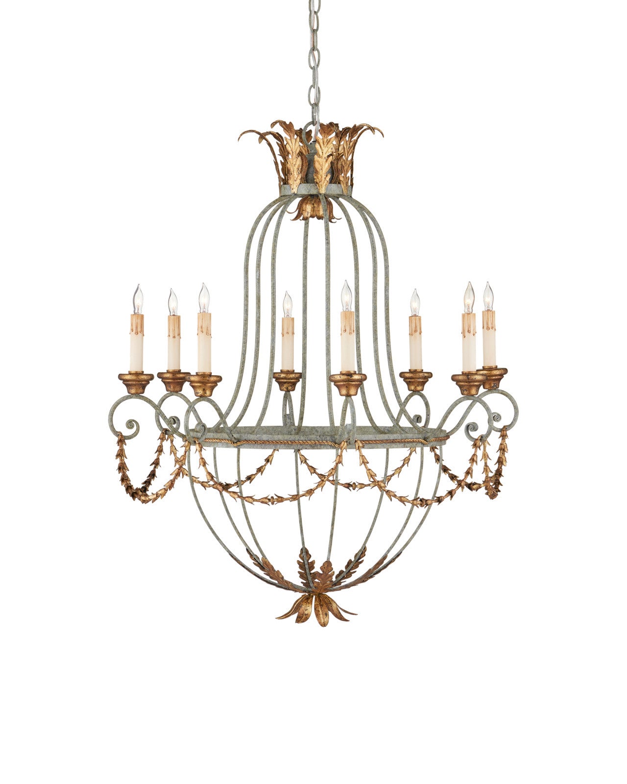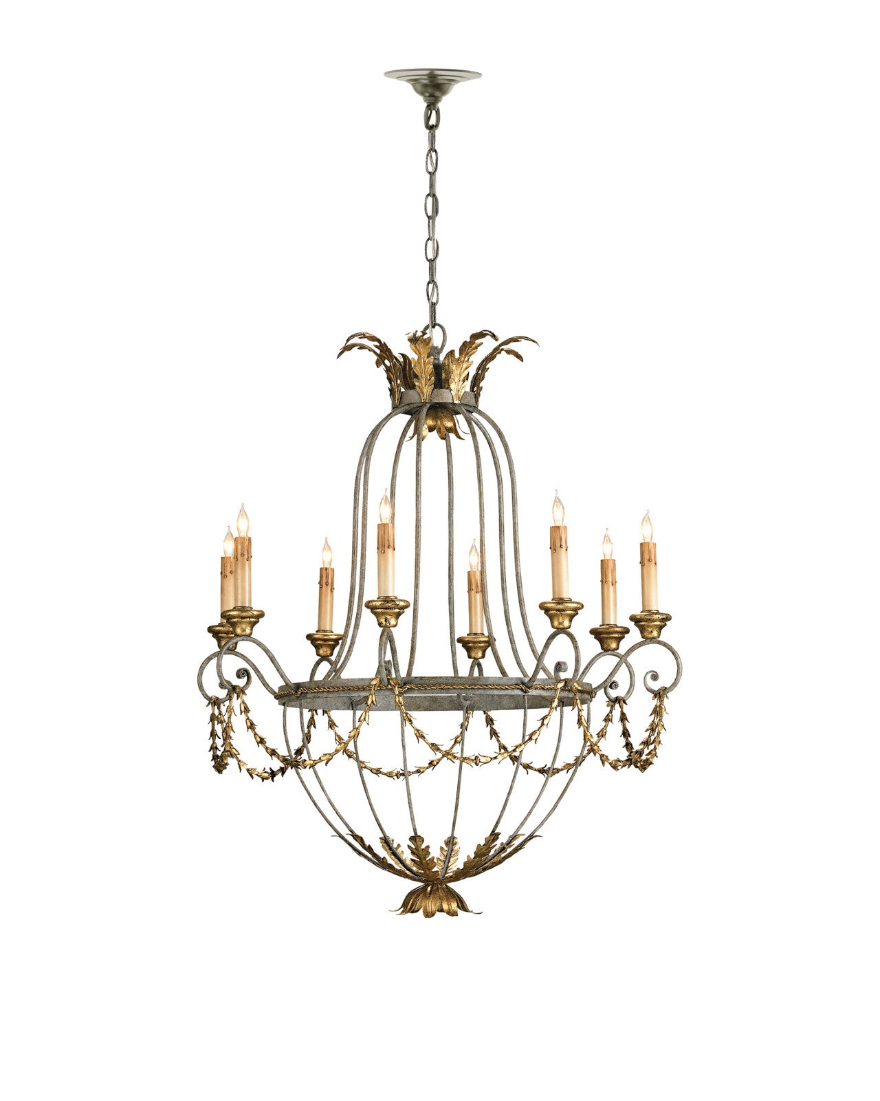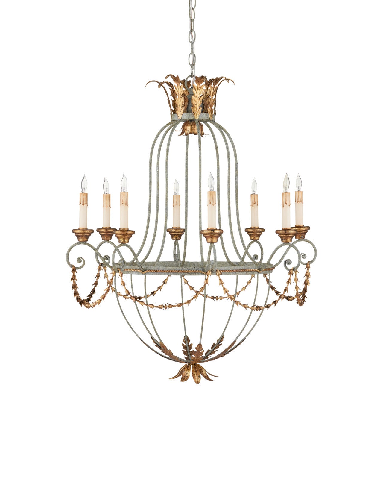 The Elegance chandelier is embellished with acanthus leaf and rope motifs, and flounces of budlike cords. Some elements are subtle in our matte Etruscan finish while others gleam in a gold leaf finish to bring this gold chandelier Italianate influences. A spritz of leaves at the top is a crowning touch on this design.