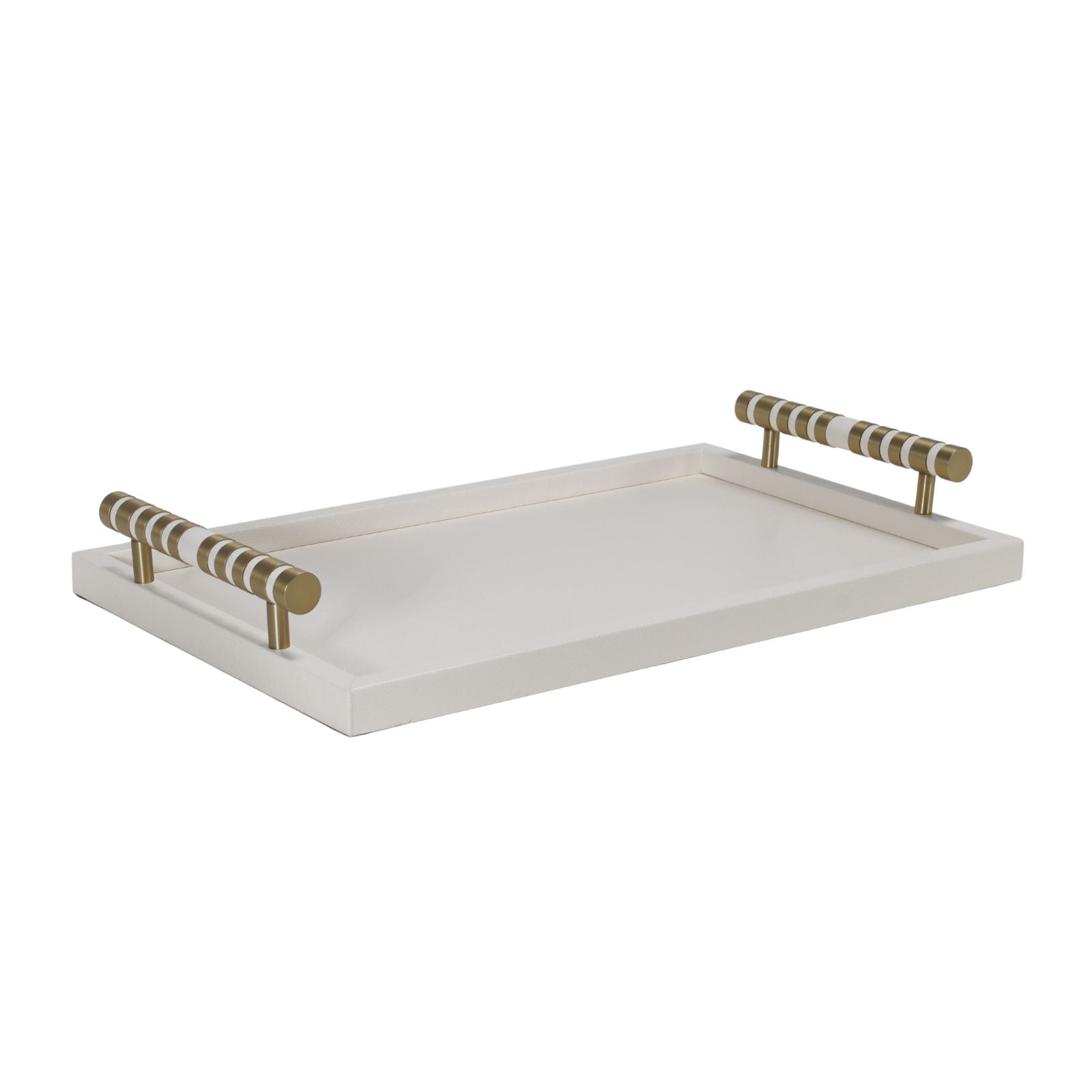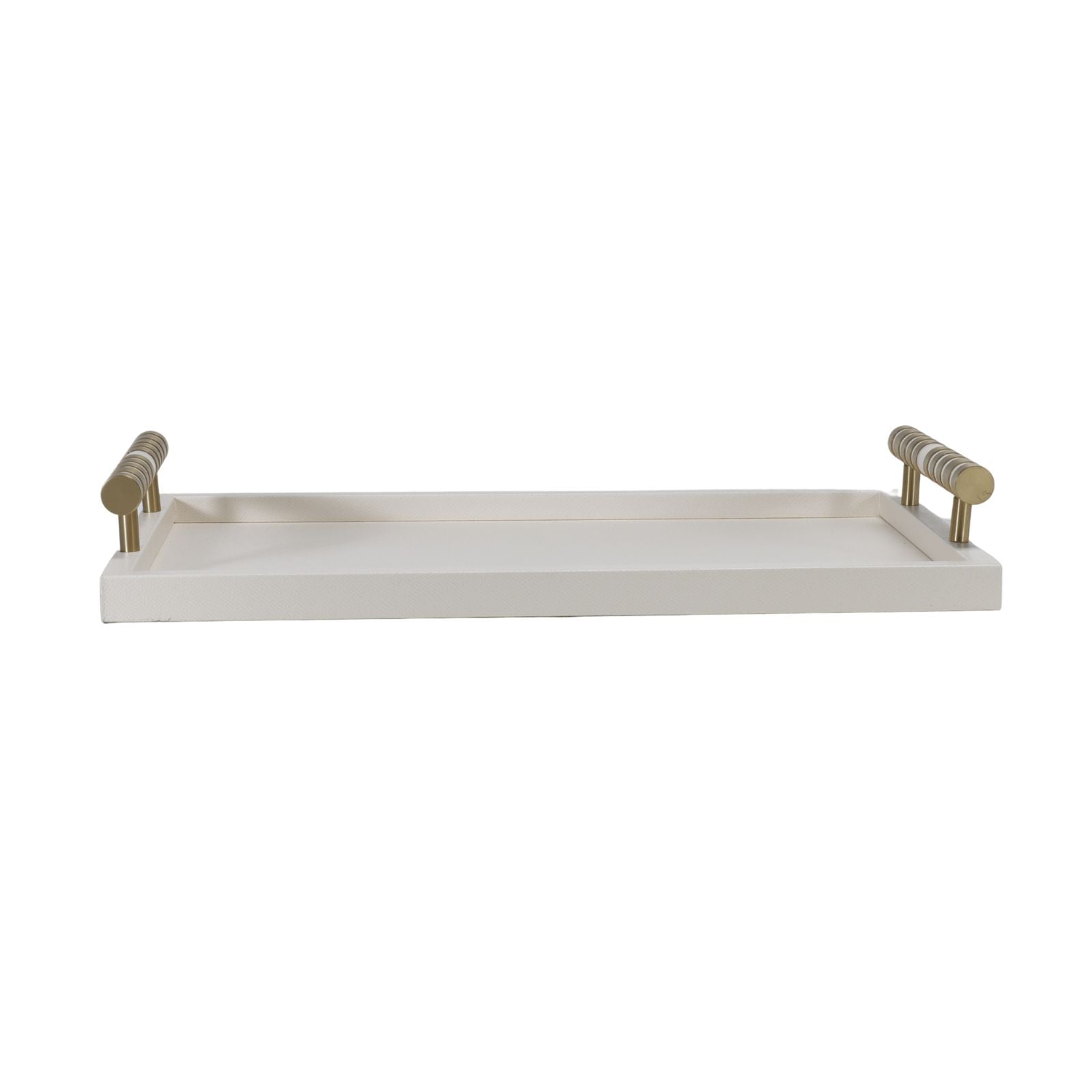 The Cambridge Rectangular Tray combines elegant beige faux leather with a striking brass-detailed handle, creating a sophisticated accessory for any room. Its refined design offers both style and practicality, ideal for serving or organizing with a touch of timeless luxury.