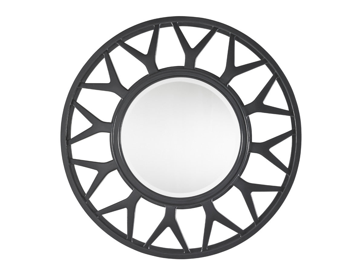The Esprit Round Mirror offers a distinctive style achieved through a unique spoke motif and radial design. The mirror features a one inch bevel.