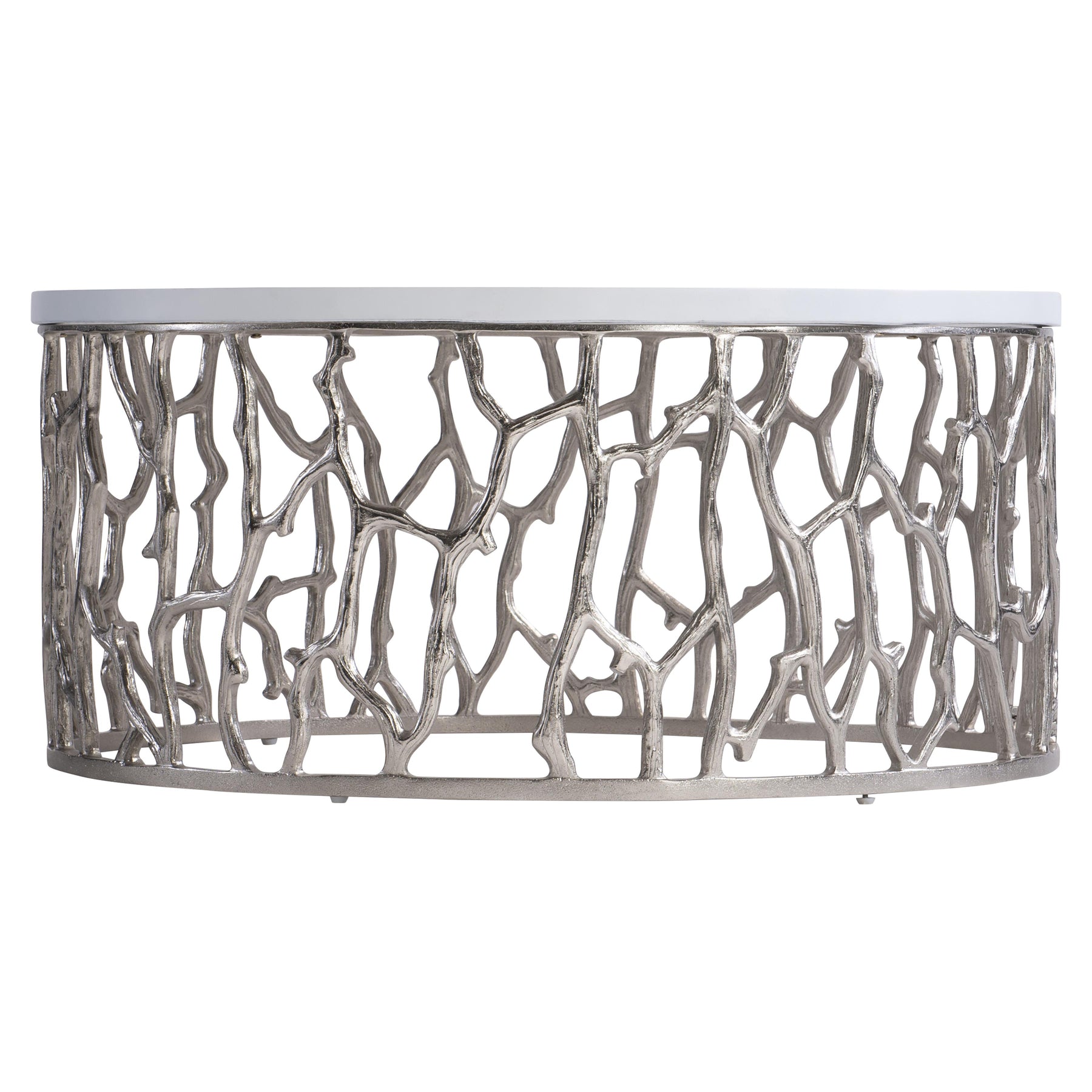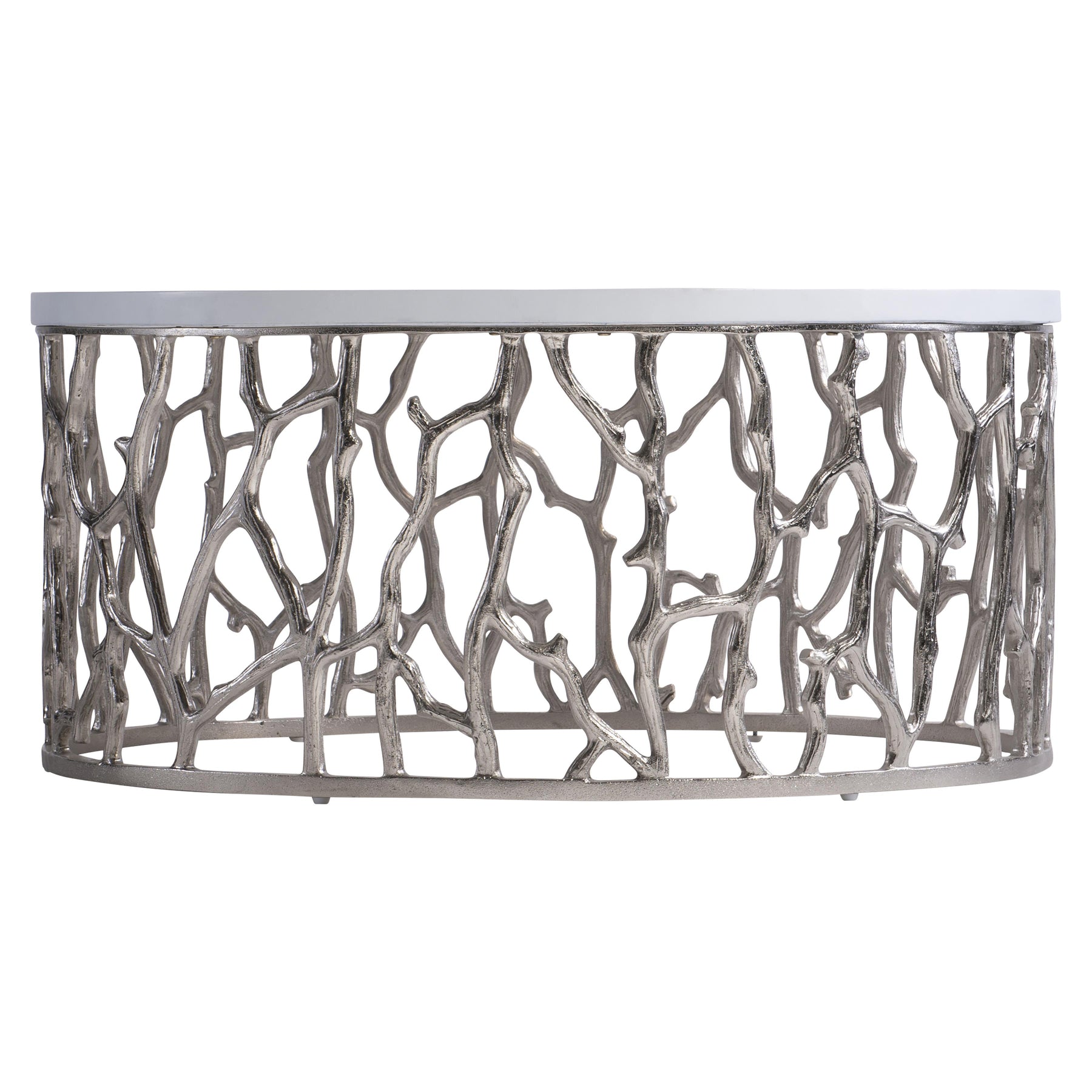 Branches crafted in cast aluminum intertwine and intersect around the base of the Milos outdoor cocktail table. The faux bois design creates an openwork pattern thats both natural and dramatic. The base supports a glass-reinforced concrete top in Bone finish.