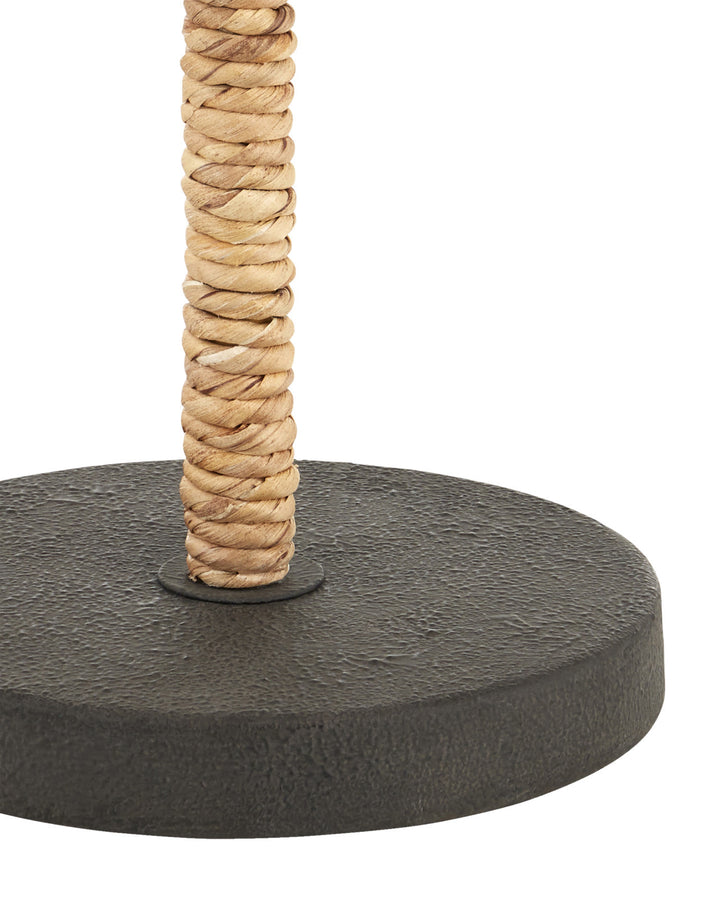 The shade is made of water hyacinth, which brings a textural artistry to the composition. Equally sophisticated is how the thin stem is wrapped in the same natural material. The mole black finish on the woven lamp contrasts the beige tones beautifully.