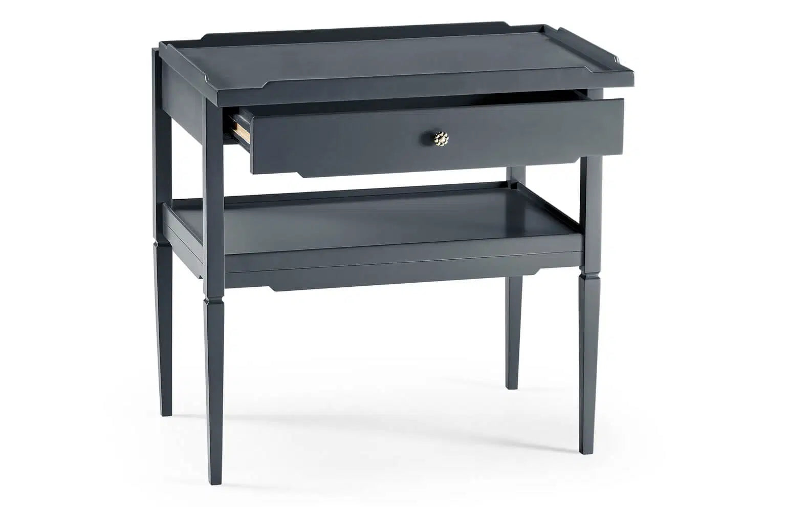 Deceptively simple, the Remanence Side Table from Jonathan Charles is bright and whimsical, delivering a cheery punch in a small package. The hardwood solid case is packed with functionality, including a lipped top that doubles as a pull out tray, single drawer lined with a zany blue and white print, power supply access and cord management and a lower shelf for oversized items. Doused in Hale Navy with custom cast hardware, Remanence is the accent piece you’ll add last but use the most.